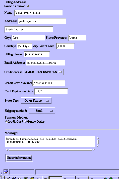 · Information is gotten from users by using PHP. For example we have to keep the information about customer (this data is needed them mailing product to customer) and about the product ordered by customer (again this data will be used in stock). So we have implemented our interface to the database by using PHP. A PHP file is called after the submit event in customer information form and all data shown in customer info page is kept to MySql database by using PHP.